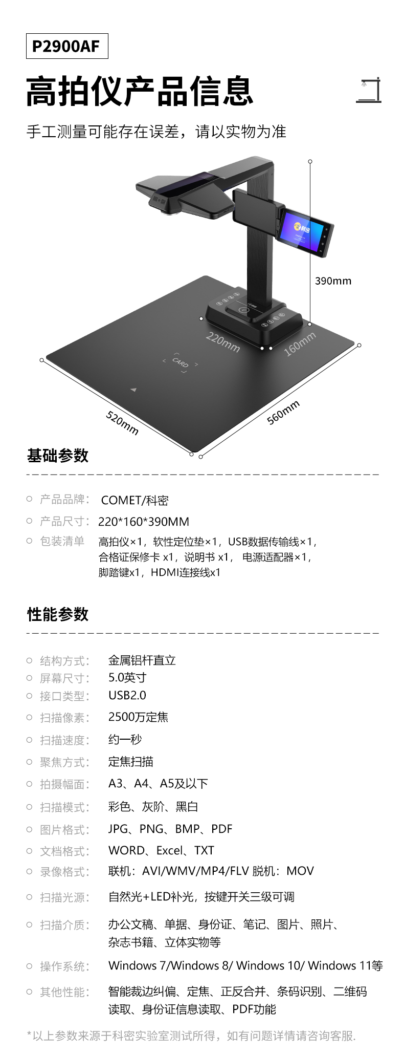 科密(comet) 新利官方网站 2500万像素A3A4可升级扫描仪 实时投影 书籍曲面展平免拆成册 预览屏 P2900AF